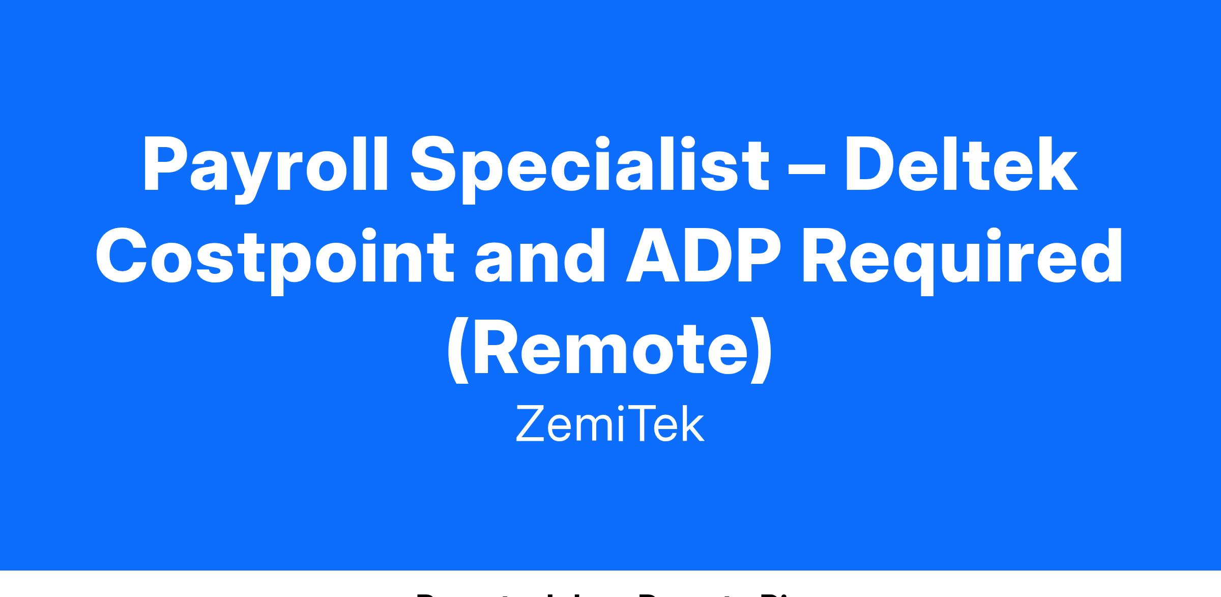 ZemiTek is currently seeking an experienced Payroll Specialist to join our growing team. This full-time position requires a professional with a strong background in high volume, multi-state payroll processing, particularly with Deltek Costpoint (8.2) and ADP’s Workforce Now. The successful candidate will be responsible for assisting on a team with all aspects of payroll processing for our multi-state organization. This is an excellent opportunity for a seasoned payroll professional to showcase their skills and make a significant impact within our company.