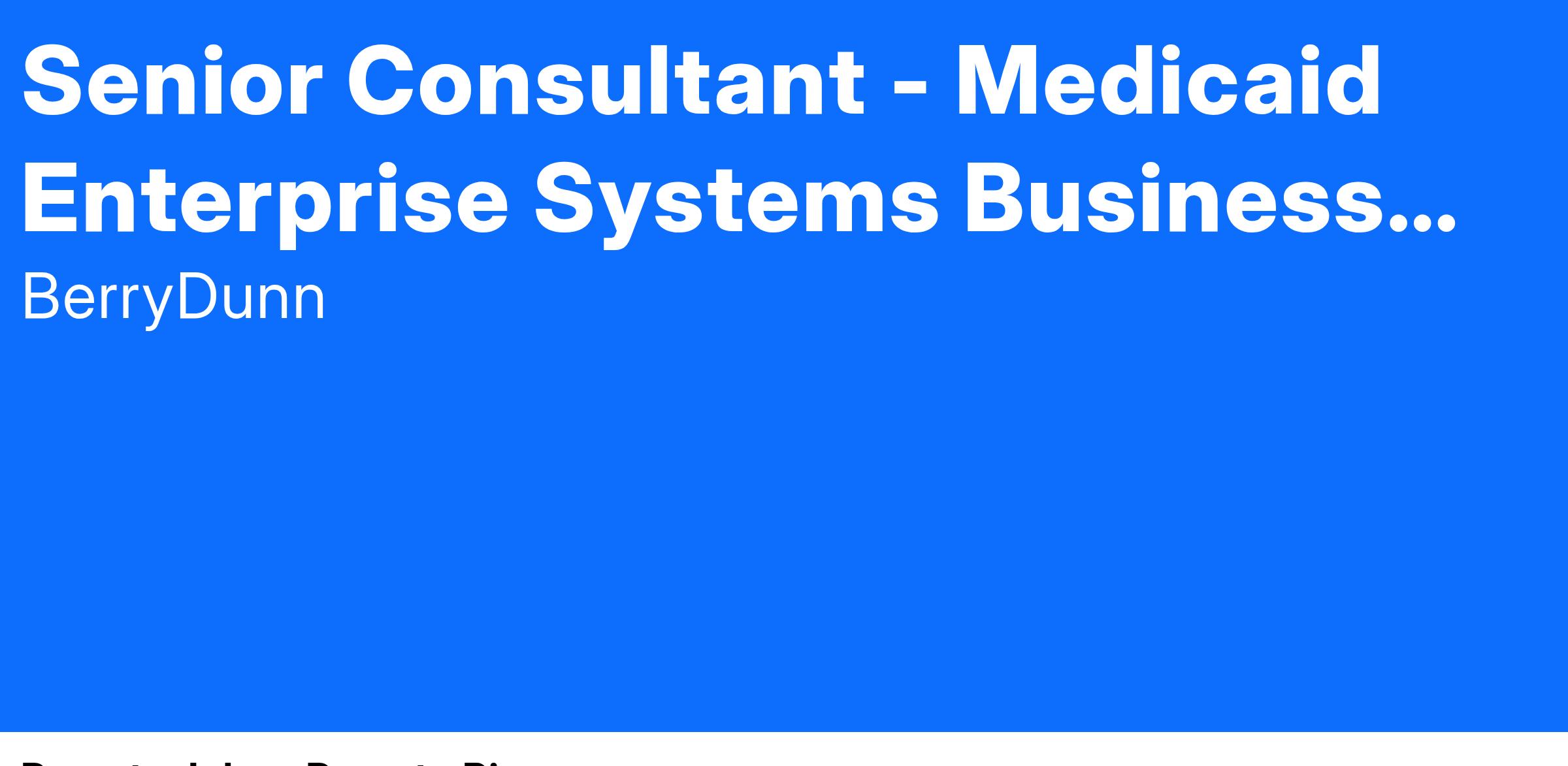 BerryDunn is seeking a Senior Consultant with experience as a Medicaid Enterprise Systems Business Analyst. This resource would be responsible for supporting our clients as they mature their Medicaid enterprise systems (MES) programs. This position is planned to sit remotely or in one of BerryDunn’s offices servicing our Medicaid clients in the U.S. Virgin Islands. You will bring a mix of demonstrated MES domain knowledge, program and project management capabilities, exceptional organizational and self-management qualities, strong and adaptable leadership, and effective written and verbal communication skills. You thrive in dynamic environments, listen actively to diverse perspectives, and bring a collaborative, flexible approach to problem-solving and team engagement.