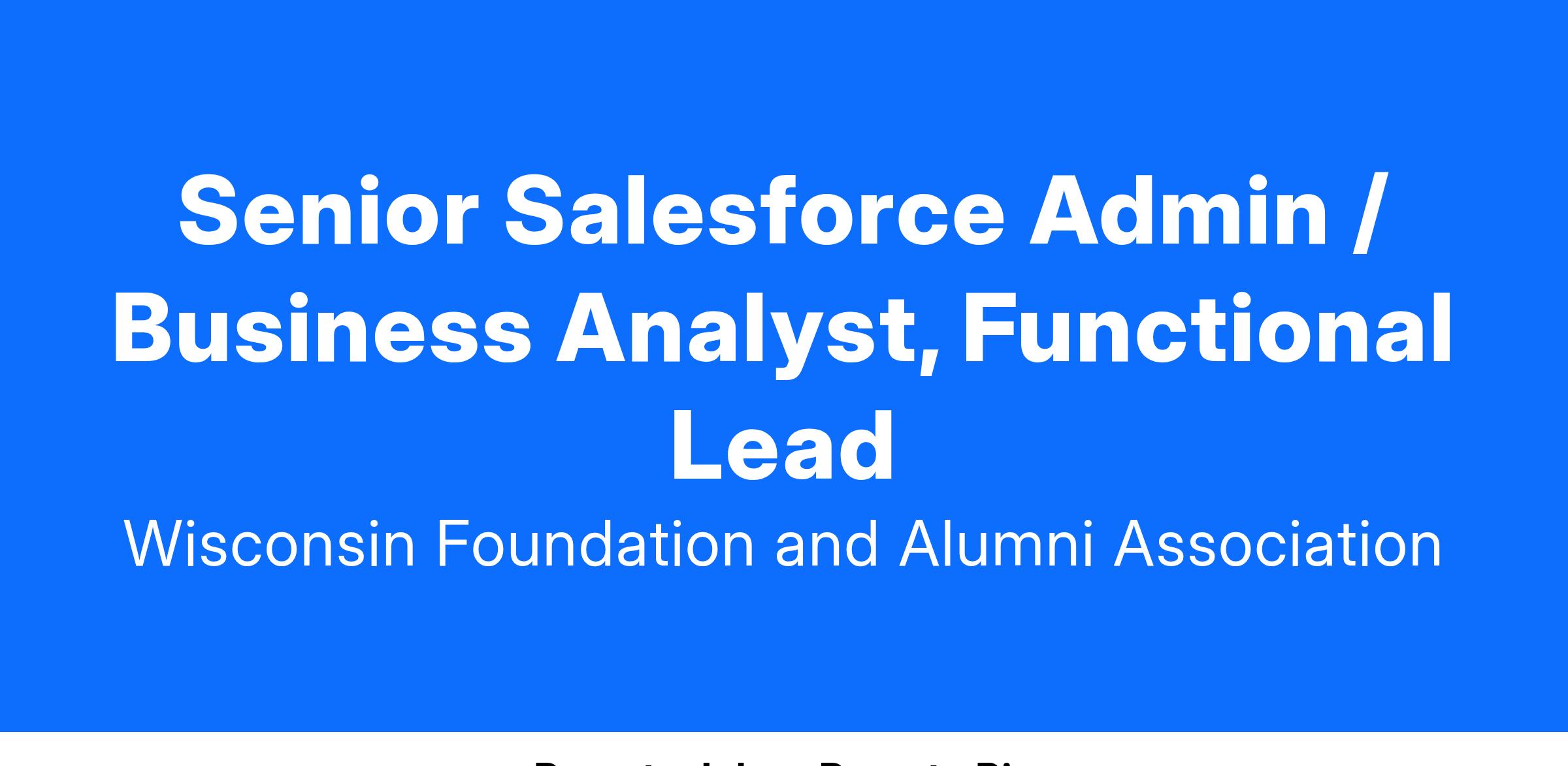 The Wisconsin Foundation and Alumni Association (WFAA)* is seeking a highly skilled and dynamic Senior Salesforce Admin/Business Analyst, Functional Lead to play a pivotal role in managing and optimizing WFAA’s CRM ecosystem. This position will focus on identifying, evaluating, and implementing innovative solutions within the Salesforce platform. As a leader, you will develop and enforce best practices for Salesforce administration and business analysis, increase operational efficiency, challenge the status quo, empower team members and users, and ensure data stewardship.
