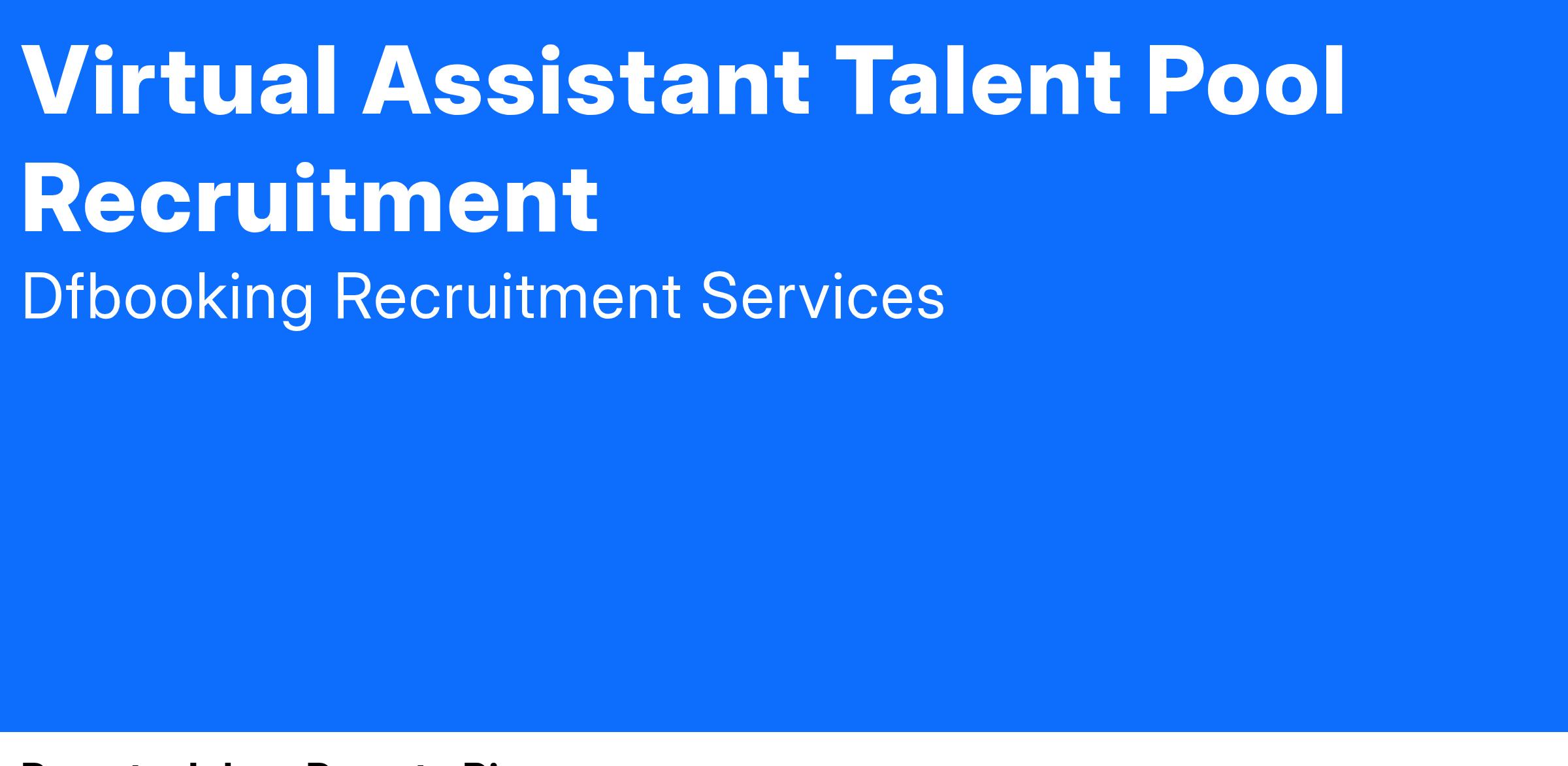 DF Booking Recruitment Services is a global staffing and outsourcing agency committed to connecting world-class virtual assistants with businesses and entrepreneurs across various industries. Our goal is to build a trusted talent pool of highly skilled professionals who are ready to support our international recruitment partners as opportunities arise.